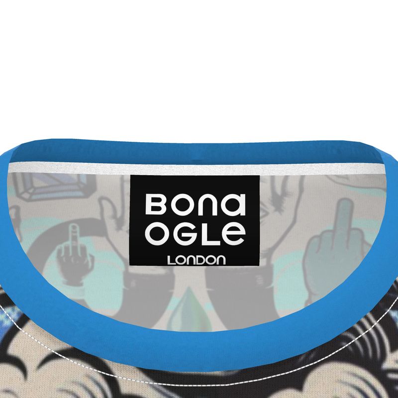 This tee is your wearable conversation starter. Against blues and greens, hands coil into spirals, bearded ladies strike iconic silhouettes, and clouds drizzle tears from faces over high-heeled giant heads. Go fitted for drama or oversized for effortless cool—either way, the print does the flirting. Available in cotton or recycled soft-feel poly, and made to order in the UK within days, it’s a unique piece that plays well with any style. Warning: strangers may stare, politely or otherwise. Fits true to size... however she is a size 10 and is wearing the 5 xl for that oversized vibe.