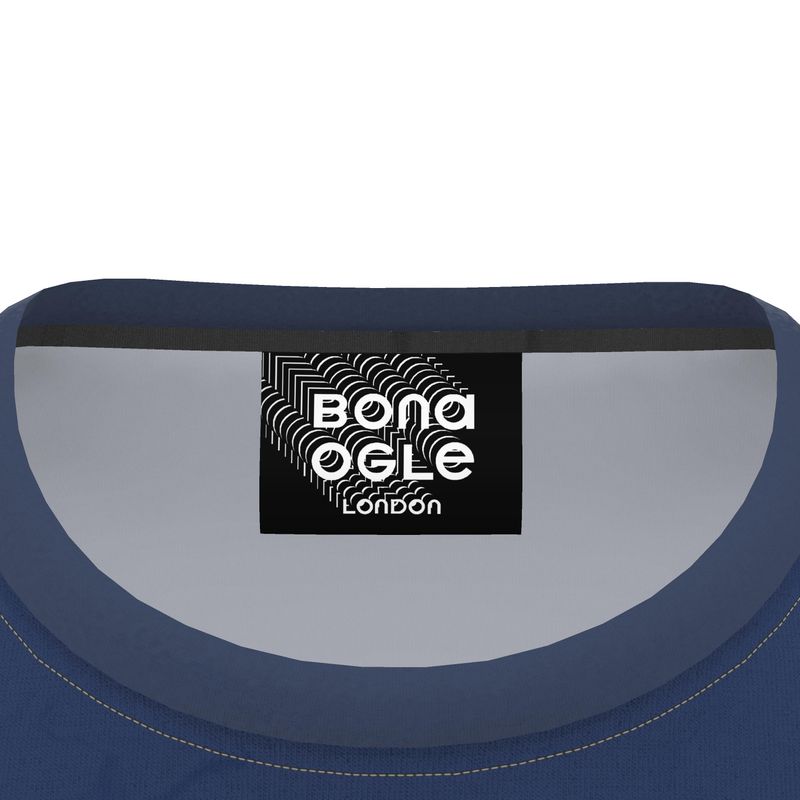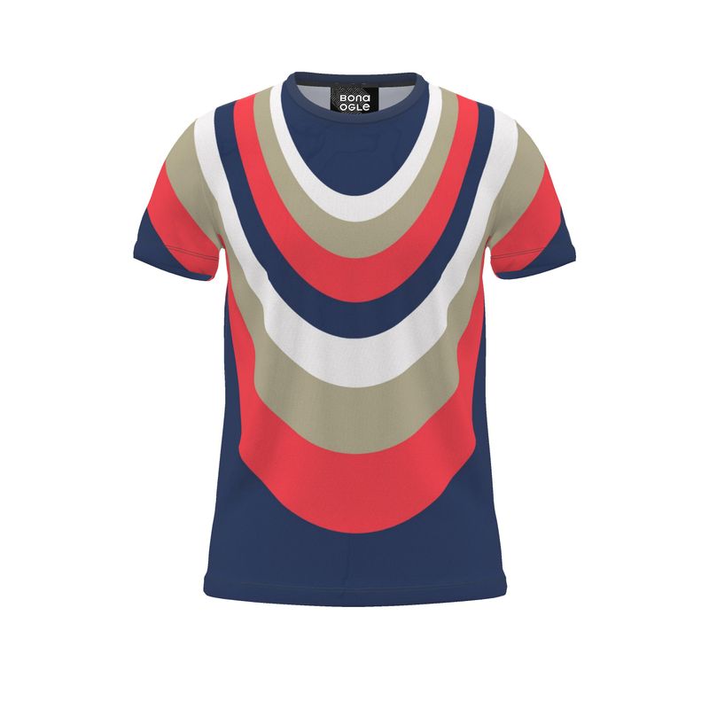This is a T-shirt with a rather lovely print made up of concentric ovals which create this drape fronted effect this time here it ois in our blue red beige and pale blue colour way. This Tee is made to order in just a few working days here in England, more sustainably than fast fashion with no waste from overproduction as we only make what you ask for to your specifications, P&P is free in the UK.