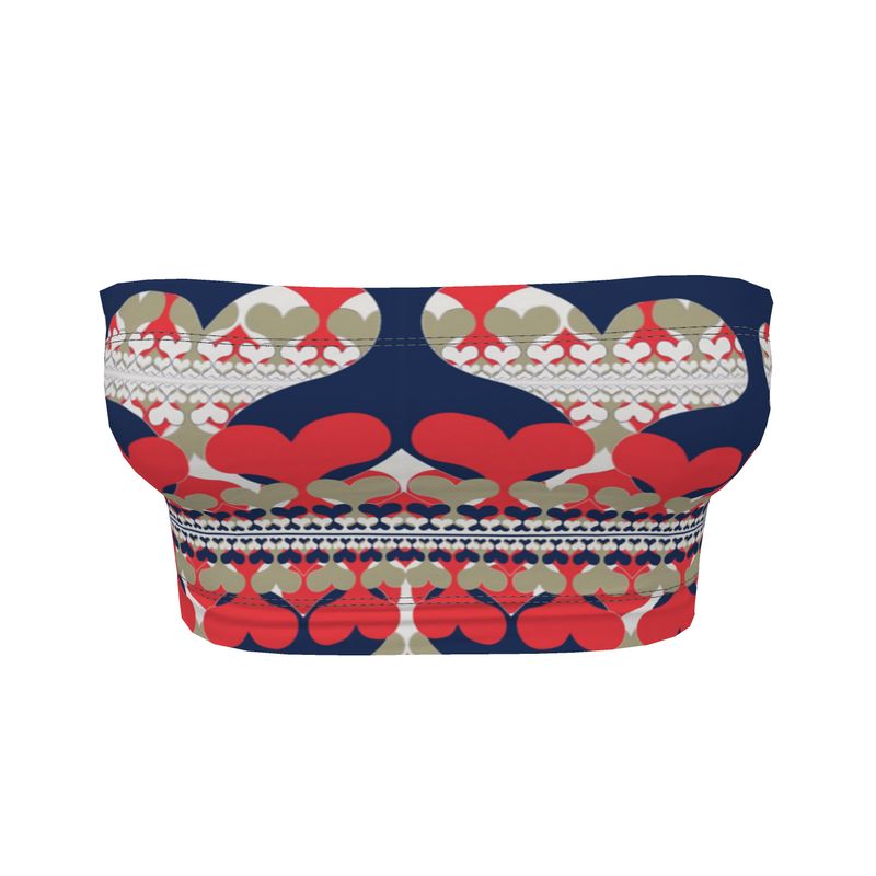 This Bandeau Boob Tube would not look out of place at studio 54, but there are many ways to wear them over or under things, not that there is anything wrong with a bit of disco styling . It was by luck that we designed these interlocking beanstalks with charming love heart leaves. Nonetheless, we have grown to appreciate them because of their ability to be resized or rotated to achieve various effects. This print has made many items even more delightful. P&P is free in the UK and yiou get 15% off when you sign for Bona Ogles News.