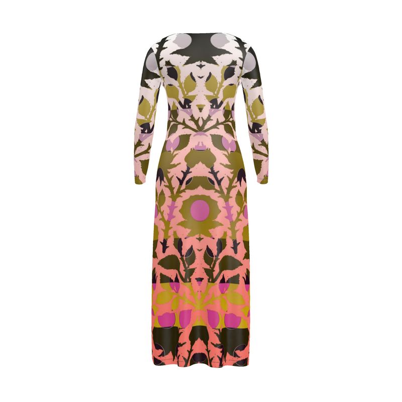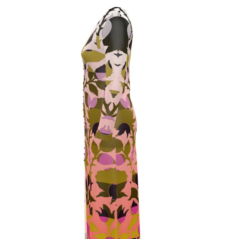 Romance with a conscience — and a twist. This cardigan dress redefines comfort dressing with its sweeping ombrés of pink and golden ochre, printed using eco-friendly inks on recycled fabrics where available. Draping just right, it buttons up or down to suit your mood: cozy or coquettish. Made to order in England within days, it’s sustainable slow fashion that doesn’t make you wait. Classic roses, modern magic, and a whisper of rebellion — like vintage couture caught in golden hour light.