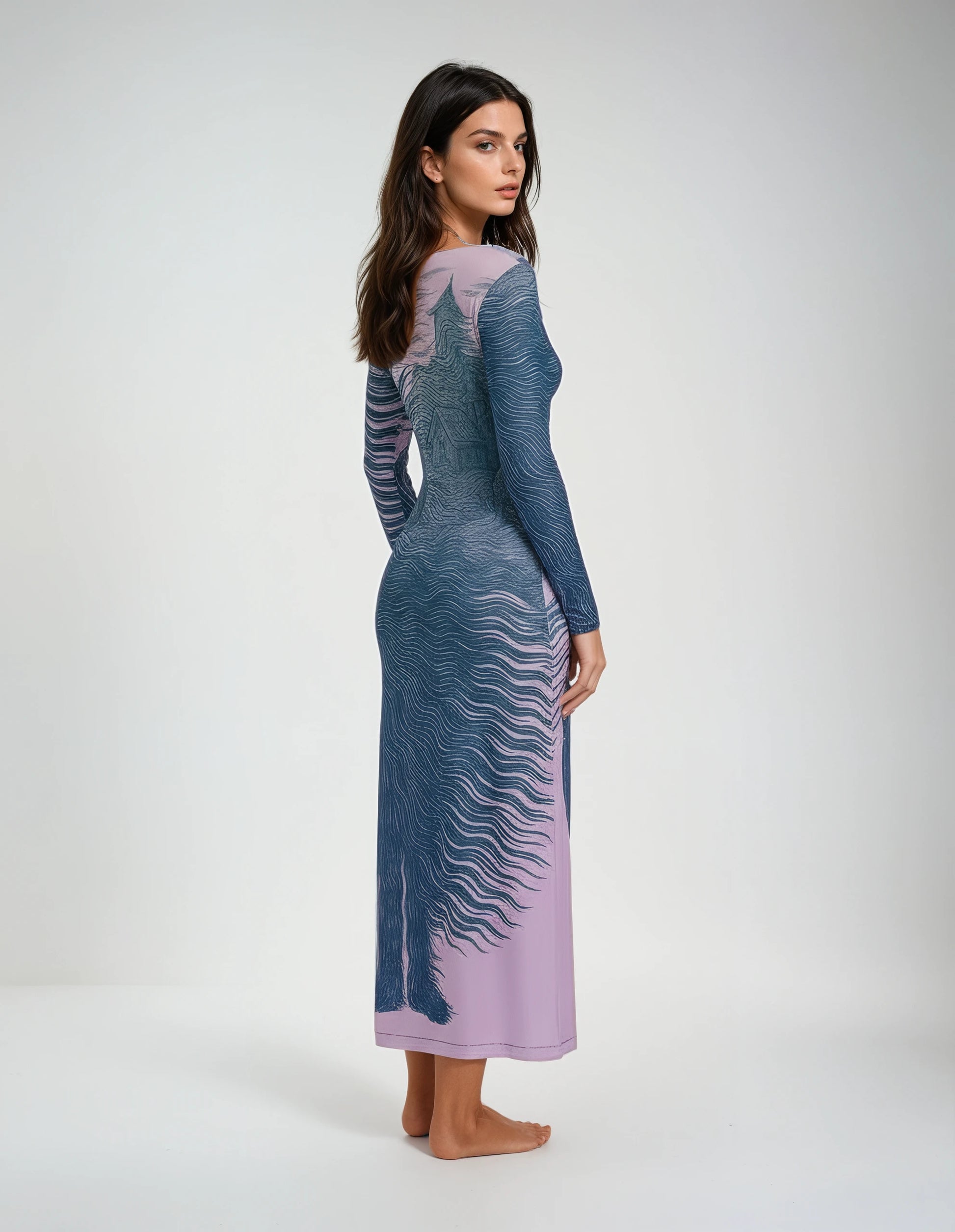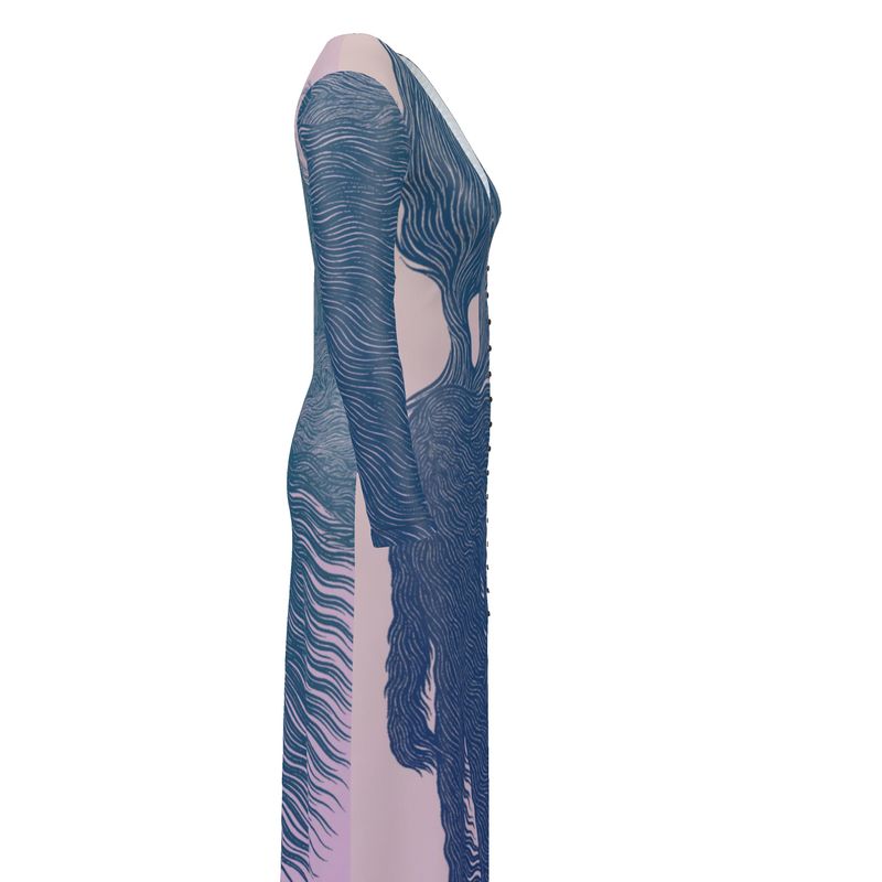 Made to order in England, this long cardigan dress brings artful motion to every step. Crafted from luxurious UK-sourced or recycled fabrics, it’s designed for drape, warmth, and shape retention. The print captures windswept beauty — a storm in the countryside, a farmhouse in the distance, and figures whose hair and garments become one with the wind. The ombré fades from earthy beige to lilac sky, with the artwork flowing in deep teal and midnight navy. Ethically made, soft as a sigh, and ready to make an entrance.