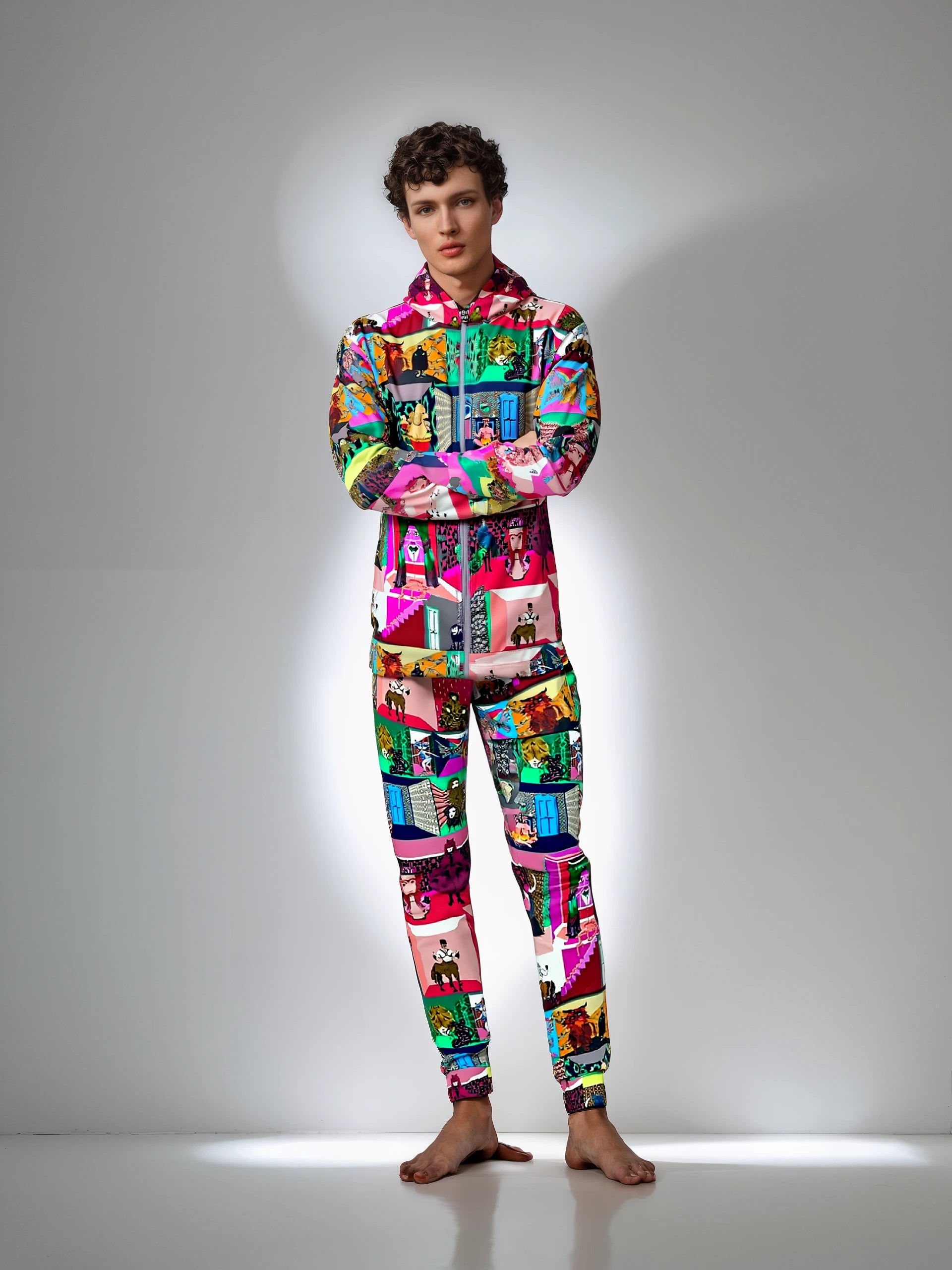 Visit Bona Ogle Towers. Encounter satyrs tending to a hairy princess, a shy room for overcoming shyness, and an overly friendly mammoth. Navigate through the poodle room cautiously and find peace in the Zen room. Enjoy tea with resident fawns before a hair makeover by butterfly men. Meet Fetish Mouse and his cat experiments gone awry. After your visit be sure to buy these souvenir trousers made in England to orders with no waste from overproduction we concentrate on the UK market so no air miles which also helps up to offer P&P free in the UK.