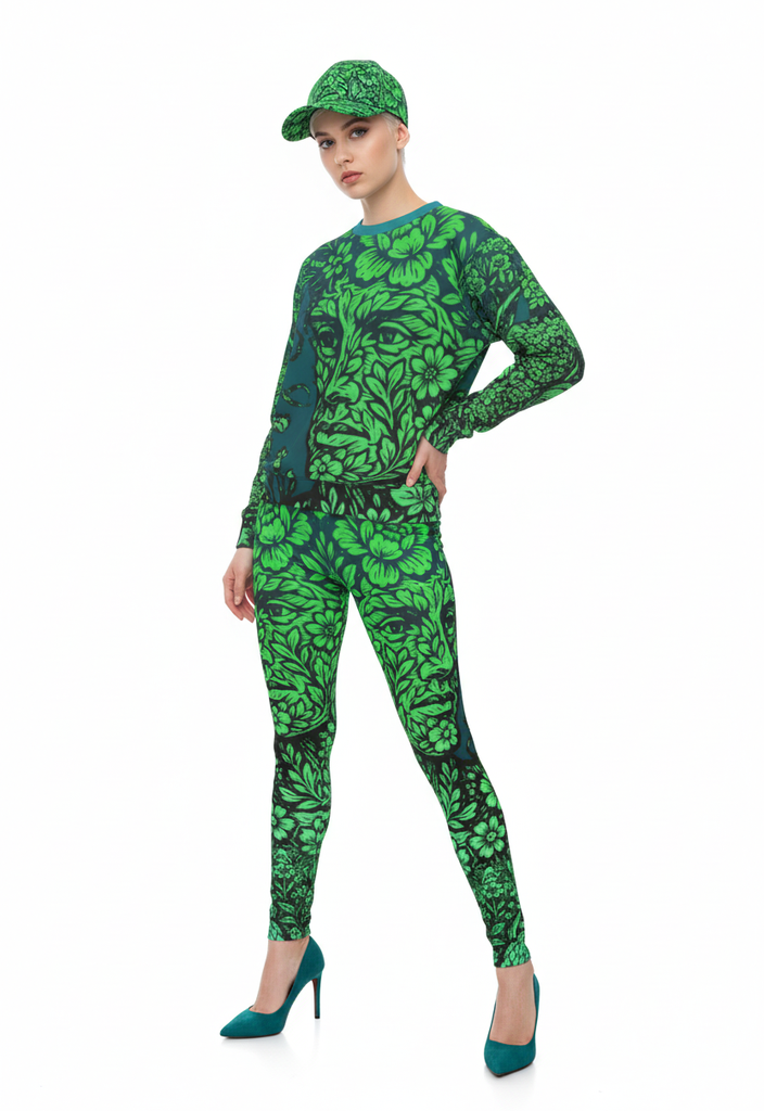 Made to order in England within just a few working days, these high-rise leggings are crafted from premium UK-sourced or recycled stretch fabric that moves beautifully and lasts. The print — our signature floral face — flows down the leg in ombré tones of blush pink and golden ochre, glowing softly like sunset light. Designed for comfort with sculpting seams and a buttery finish, they bring art, ethics, and attitude together. Made only when you order, so nothing goes to waste — just timeless design with a wink.