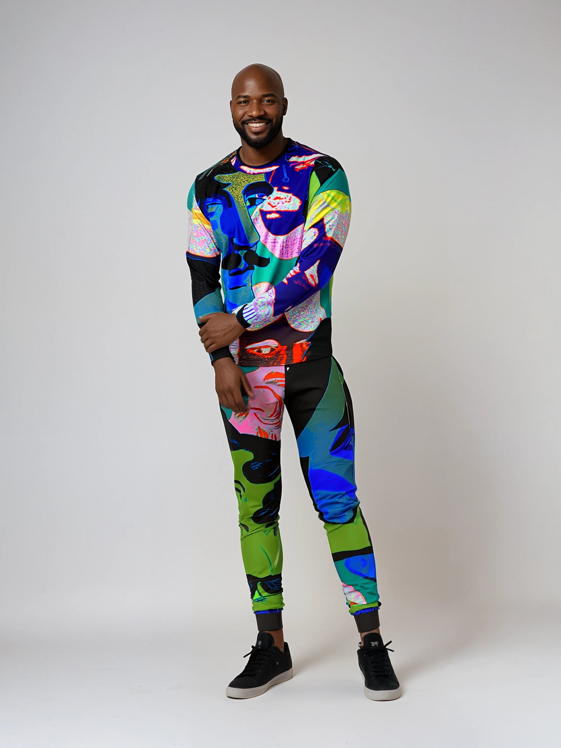 For the ladies and gents, for the gender-fluid and non-binary for everyone who was a little androgynous or who got picked on at school here is a print in celebration of you all these dysfunctional dandies, are celebrated here in portrait form, taking on the hues of Soho neon signs and disco lights, on the rather excellently cut canvas that are in fact our jogging bottoms. Wear these and be the bees knees and the dogs' boll**ks all rolled into one.