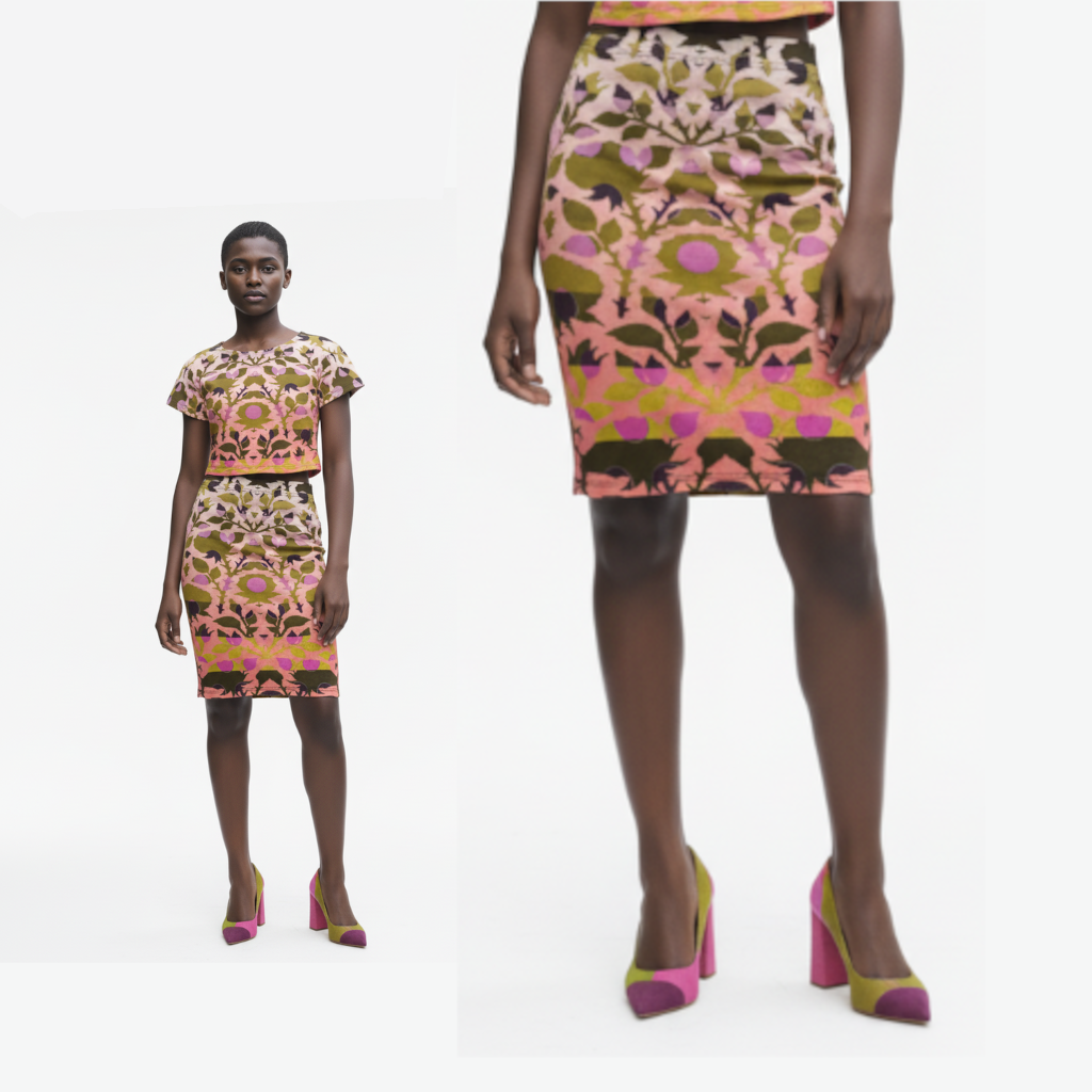Streamlined sophistication, printed to perfection. This pencil skirt brings structure and softness together — a golden-rose print with subtle striping that flatters from every angle. Made to order in England with sustainable fabrics and eco-friendly inks, it’s polished, practical, and planet-conscious. Office to evening, it moves with quiet confidence.