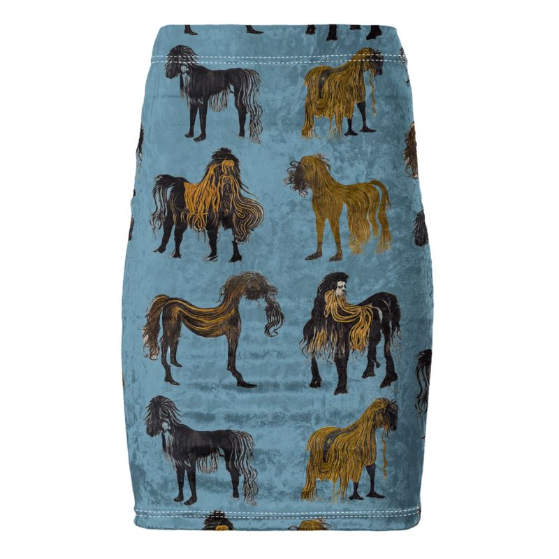 Here she is again good old dependable pencil skirt looking totally adorable, this time covered ,as you would be if you hit that buy button, in illustrations of delightful hairy mutant horse type creatures, in this rather lovely air force blue colour. She is made to order here in good old London town, and we think in this print she'd get on extra specially well with the classic T in 7xl for some oversized chic, but I also see her being very good friends with sweatshirt! She will be ready to post after her birth, which takes place only a couple of working days after you order.