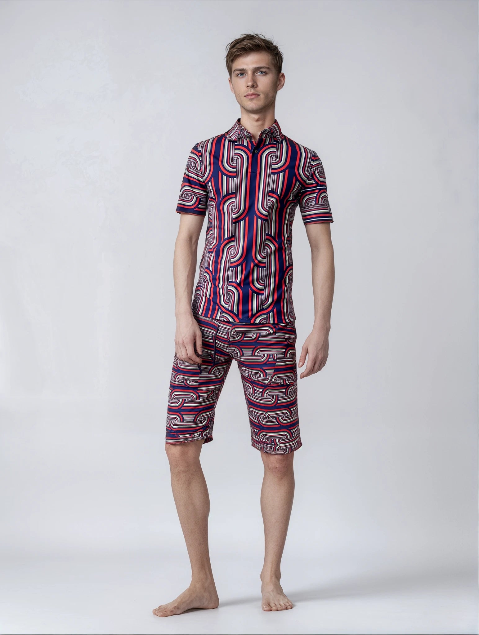 Our Chunky Chains polo in blue, red, and beige intertwines timeless tones with a touch of audacity. This design declares your devotion to distinctive details without uttering a word. Crafted conscientiously in the UK, each shirt sidesteps the sins of fast fashion. Slip it on and let your look link you to the legends of style—chainmail not included.