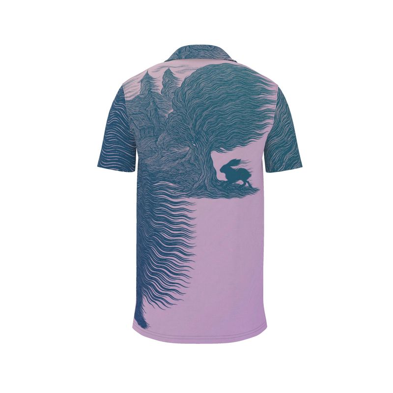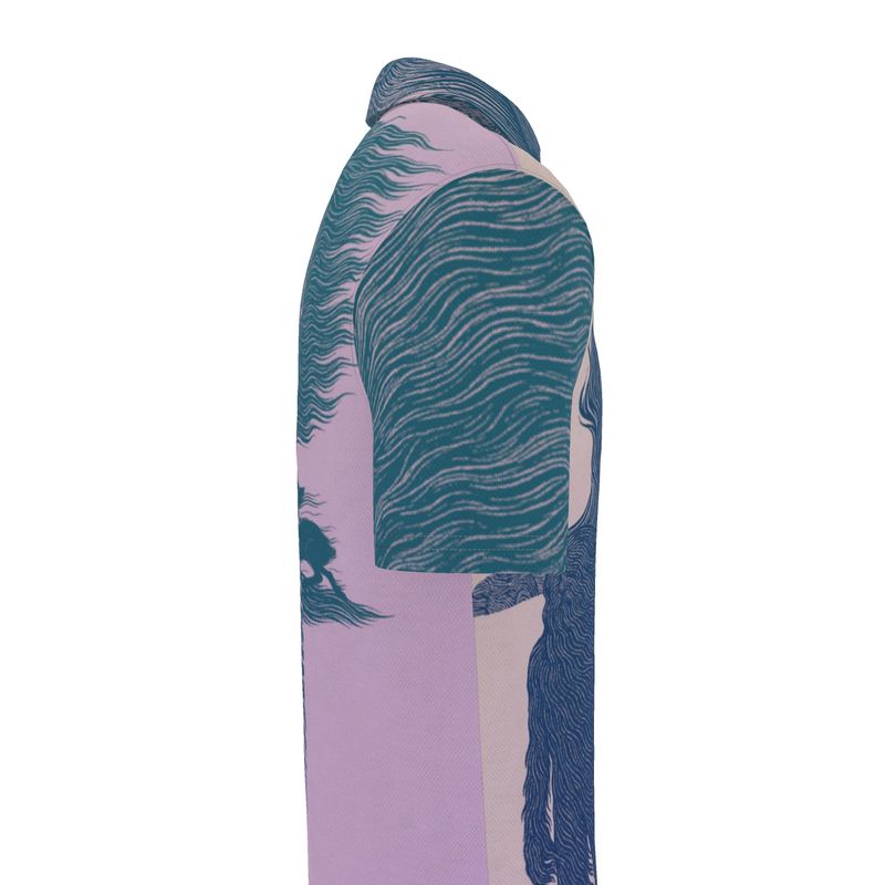 This is the countryside polo, rewritten. Made to order in England within days from fine, sustainably sourced or recycled fabrics, it pairs clean lines with painterly motion. The print — windswept trees, flowing hair, and heroic figures — ripples in deep teal and navy over an ombré backdrop of beige and lilac. Soft, structured, and quietly daring, it’s a conversation starter disguised as a classic.