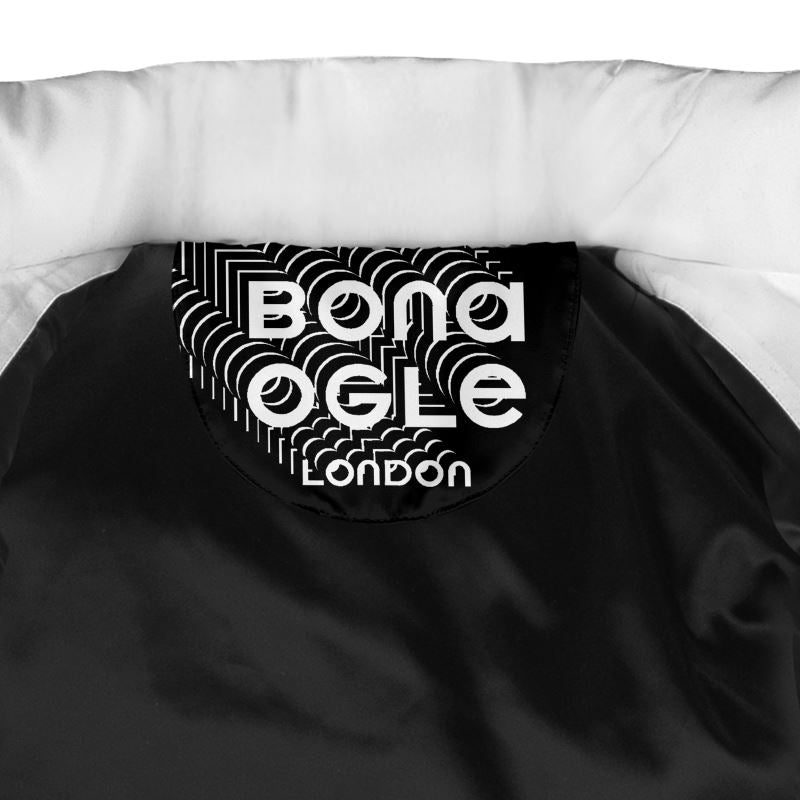 Here he comes, and he really is gorgeous., This time it's the puffer jacket's turn to get the gorgeous treatment with this print of a rather handsome man in a blindfold with a moustache is available now on our new Puffer jackets which are made to order in England in just a few working days, check out the other pieces in this print you will find him used again in surprising ways making it easy to mix and match an entire ensemble.With no over production and domestic post, we save waste and travel, making us much more sustainable than fast fashion.