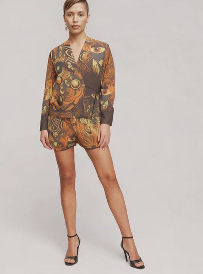 Dear customer, I present to you a pair of running shorts that have a real sports lux vibe and would look great with so many pieces from this collection of prints or from the sister print in the same combination, of colours called Nishta Nana, it is designed to compliment this one. This print itself is called omniscient and is inspired by a duress worn by Elizabeth which was covered in eyes ears to signify her omniscience.