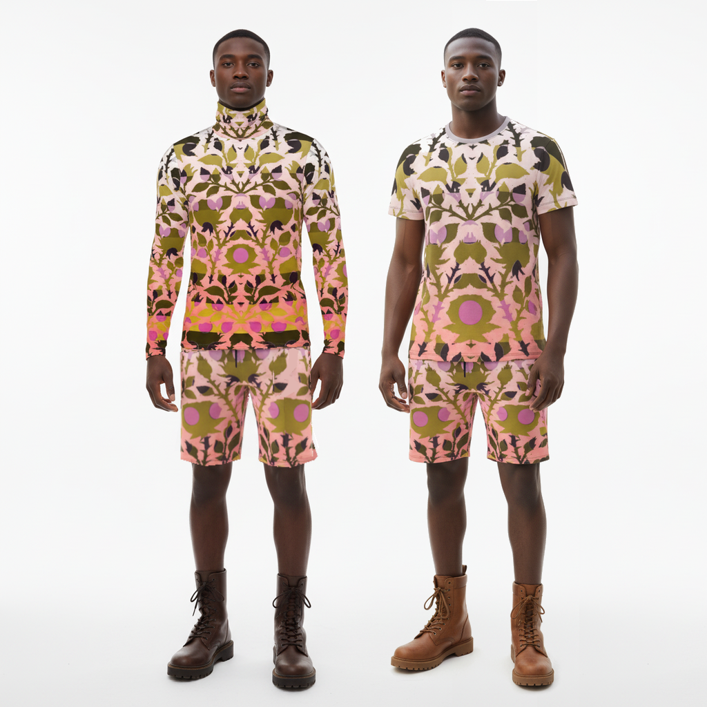 These sweat shorts mix sporty ease with standout design. The pink-and-ochre print brings a warm glow to off-duty days, while ecological inks and local fabrics keep the footprint light. Made to order in England, so nothing’s overproduced. Pair with the matching top or a simple tee — comfort never looked so considered.