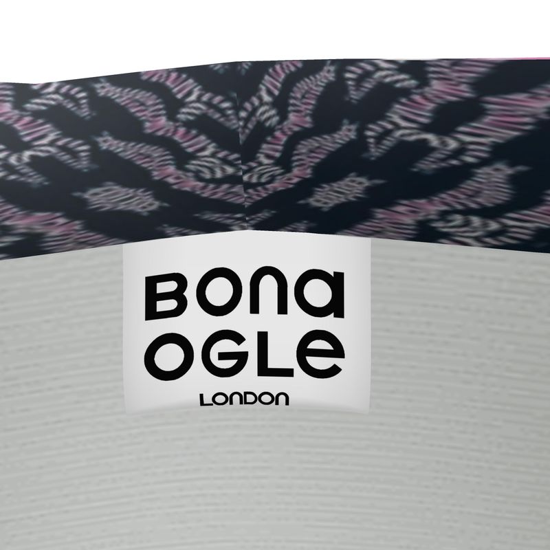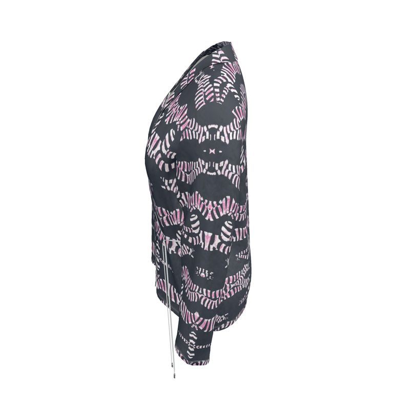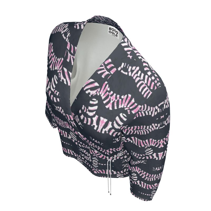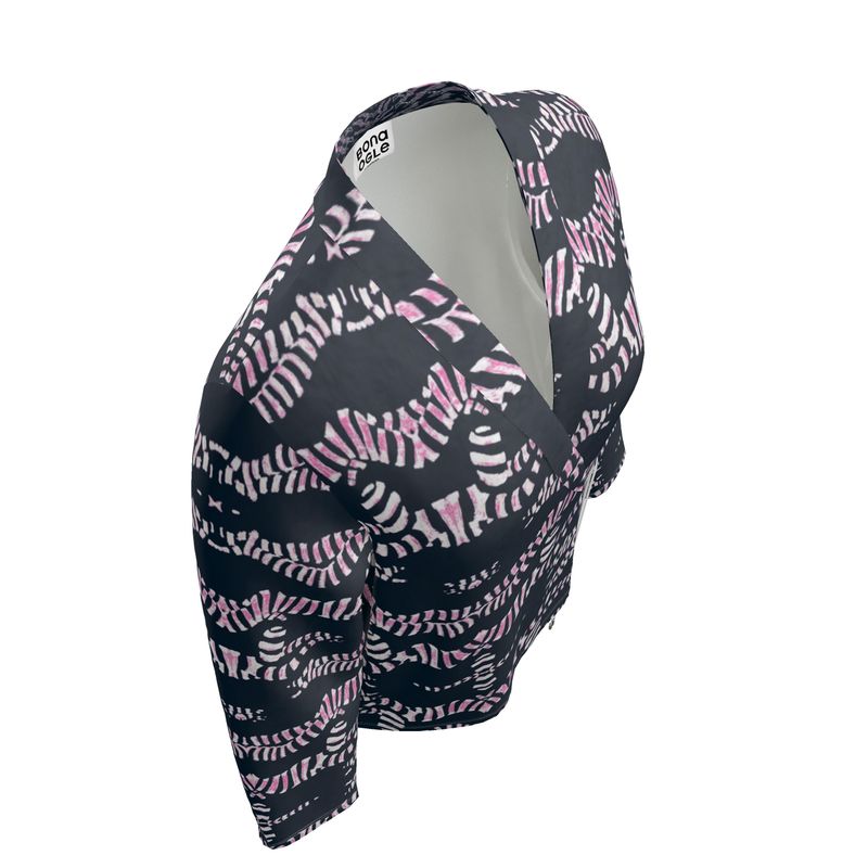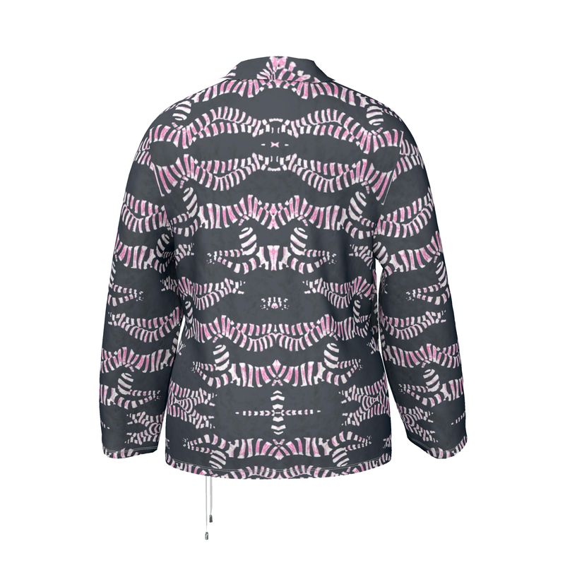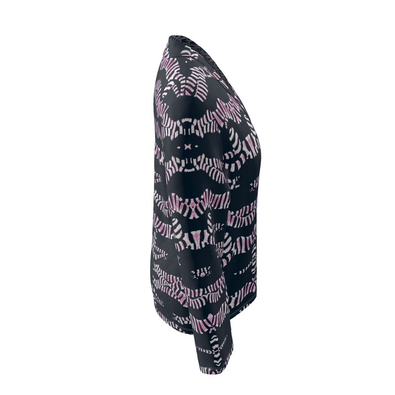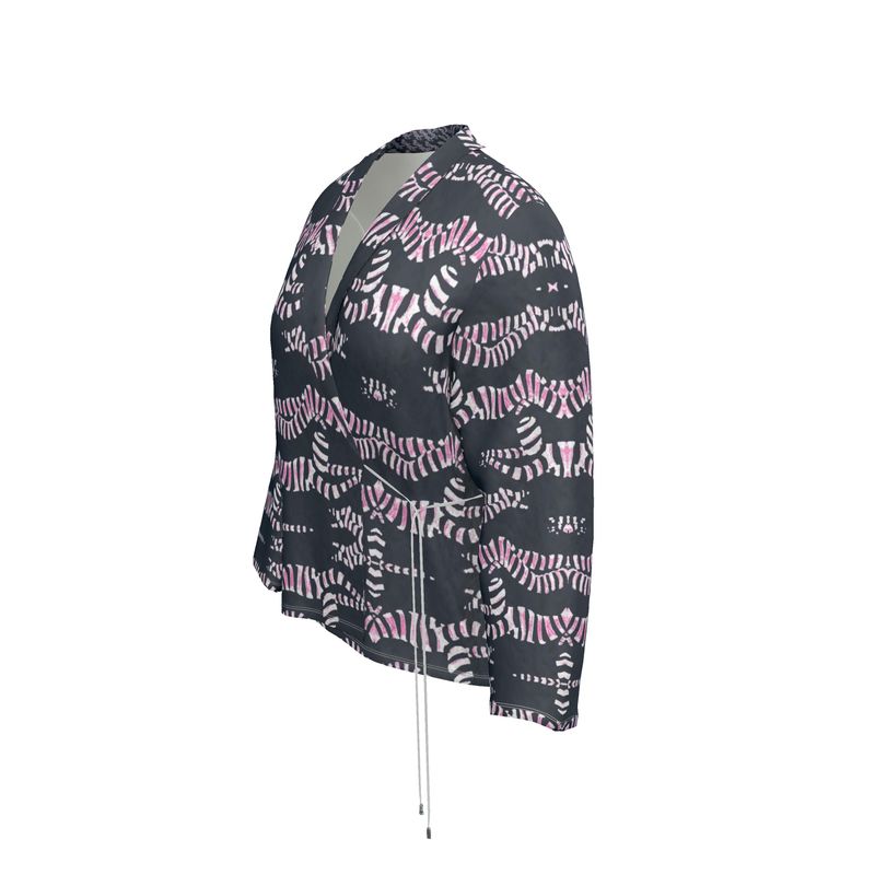 Now, let's discuss this print, t all started with a life drawing of my partner with this dark navy teal backdrop, and our character dressed in blush pink stripes. He's diving, soaring, and merging with himself, creating an abstract blend of striped patterns, bodies, arms, and legs. That complete, anatomically accurate image, it's a bit elusive, here and gone. Anyway, made to order here in the UK this striped man is on our ever popular wrap blazer, this versatile jacket can be in the post in just a couple of working days.